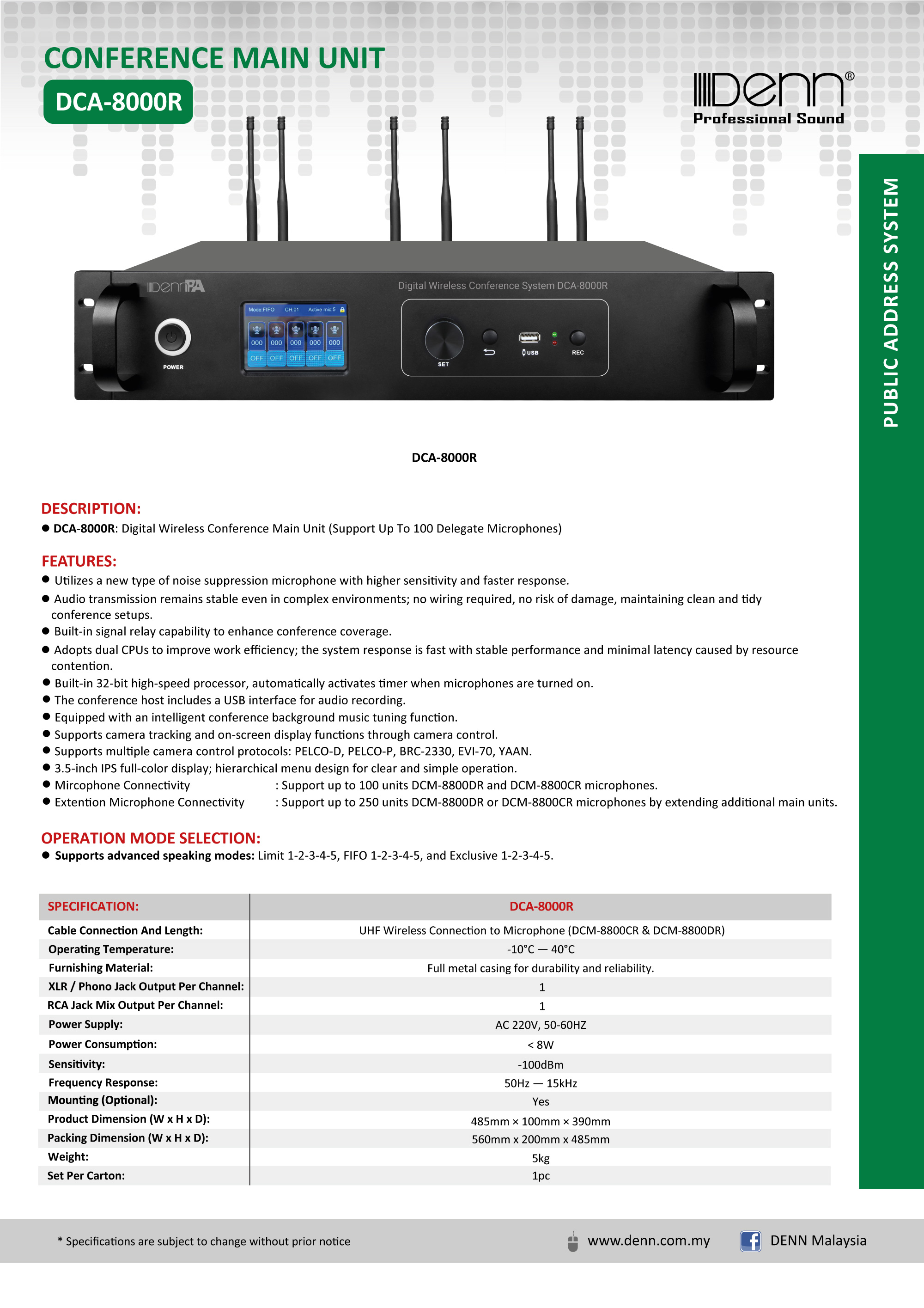 | Extention Microphone Connectivity | Support up to 250 units DCM-8800DR or DCM-8800CR microphones by extending additional main units. |