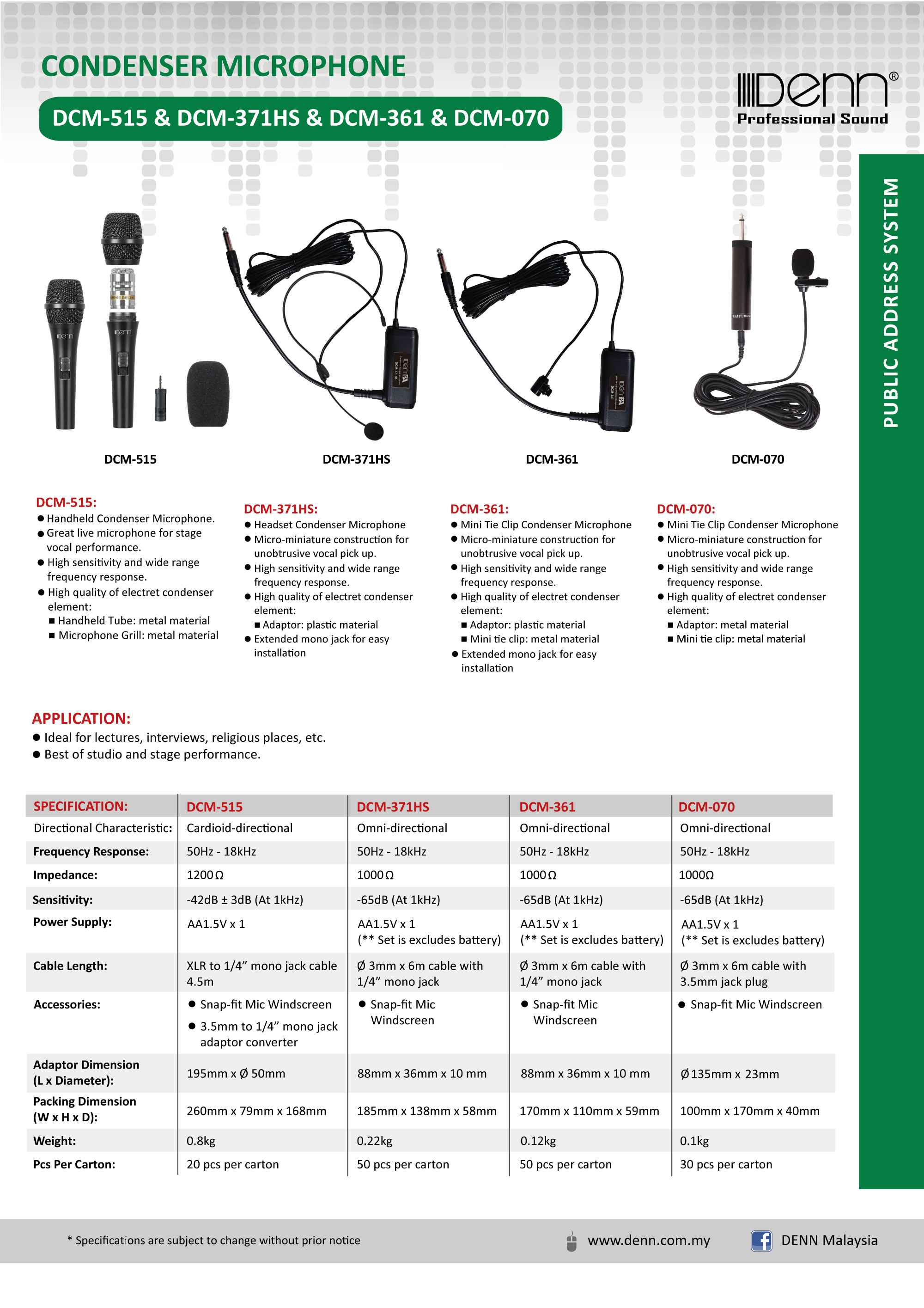 | Microphone Cable Length (Diameter x Meter) | Ø 3mm x 6m cable with 1/4” mono jack |