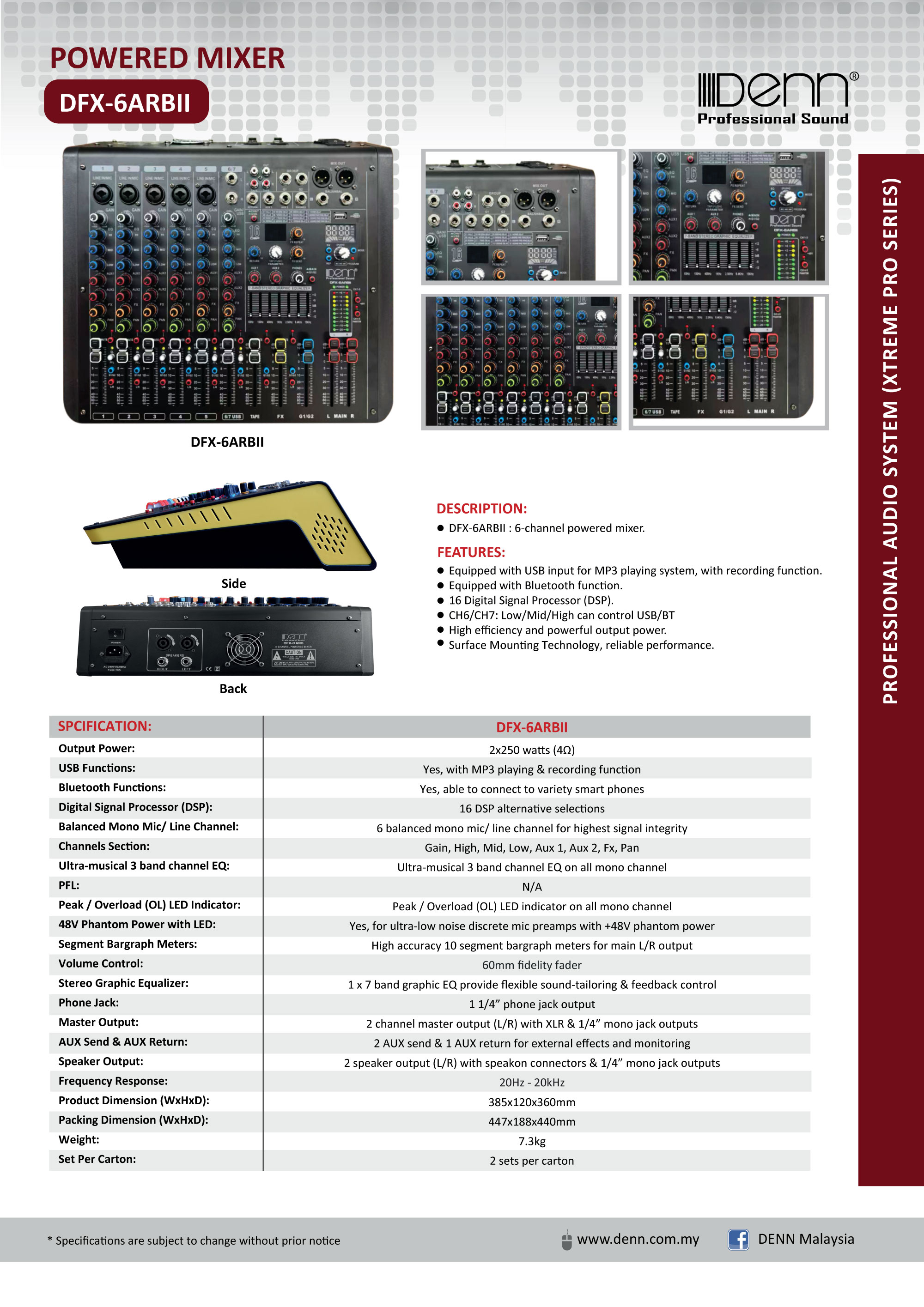 | Stereo Graphic Equalizer | 1 x 7 band graphic EQ provide flexible sound-tailoring & feedback control |