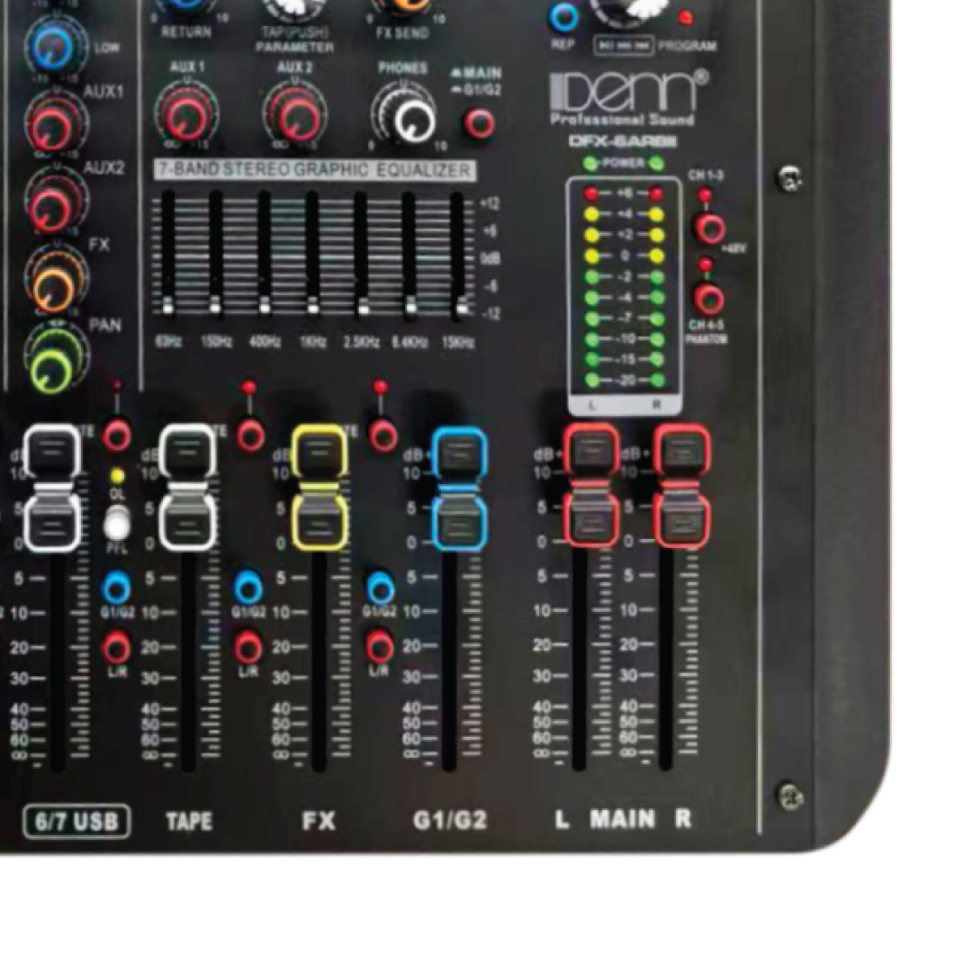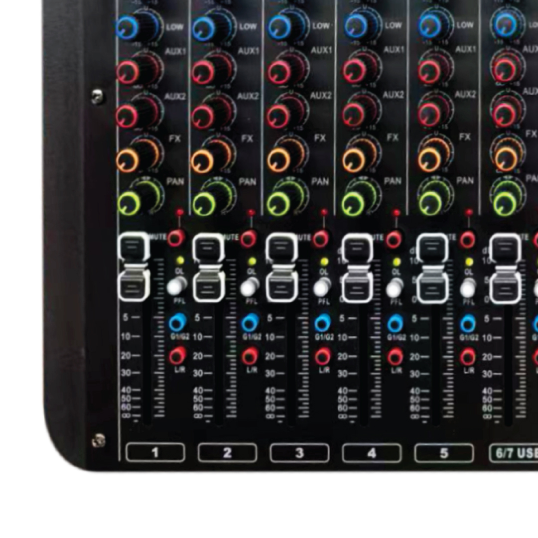 | Channels Section | Gain, High, Mid, Low, Aux 1, Aux 2, Fx, Pan |